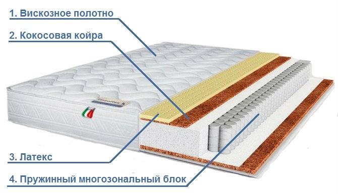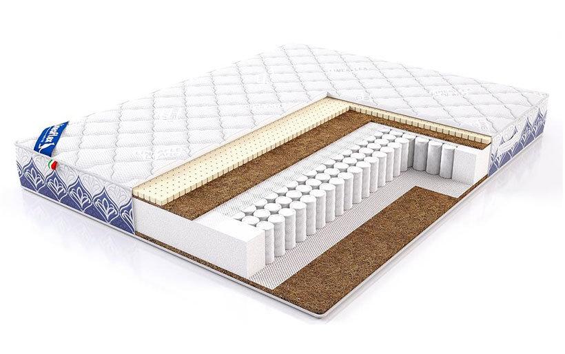 Характеристики: Жесткость: комбинированный Нагрузка, кг: 140 Пружинный блок: независимый Высота, см: 22 «Lineaflex» Bottichelli — ортопедический матрас, стороны которого имеет ассиметричную жесткость. В его основе независимый блок пружин, 256 штук. Благодаря чему ваше тело получает максимально качественный отдых, ведь каждый участок матраса отвечает особенностям анатомического строения человека, обеспечивает равномерное распределение веса. Матрас «Lineaflex» Bottichelli позволяет позвоночнику находиться в своем естественном положении. Это особенно важно, тем, кто ведет сидячий образ жизни или напротив, выполняет активные действия, из-за которых позвоночник получает серьезные нагрузки. ИЗ КАКИХ СЛОЕВ СОСТОИТ МАТРАС «LINEAFLEX» BOTTICHELLI? Чехол Quattro Stagione — шелковистый, приятный на ощупь материал, обладающий высокой прочностью. Состоит из натуральных волокон вискозы из древесной целлюлозы и полиэстера. Наполнение стежки несъемного чехла — холлофайбер. Такой чехол помогает сохранить здоровый микроклимат во время сна и не электризуется. Кокосовая койра (1 см на верхней стороне и 2 см на нижней) — плиты, которые придают поверхности матраса необходимую жесткость и упругость. Это экологичный, воздухопроницаемый материал из кокосового волокна, обладающий гипоаллергенностью и устойчивостью к влаге. Благодаря этим свойствам ваш матрас прослужит очень долго и сохранит свои качества. Латекс (2 см) — дополнительный слой с одной стороны матраса. Экологически безопасный материал используется для увеличения упругости и более точной адаптации под контуры вашего тела. Эта сторона матраса более мягкая, но при этом все ортопедические свойства сохранены по максимуму. Независимый блок пружин, 256 штук — конструкция матраса создана с учетом строения тела. На матрасе «Lineaflex» Bottichelli вы сможете полностью расслабляться и глубже погружаться в сон каждую ночь. Онлайн заказ, доставка по всей России, стоимость доставки в цену товара не входит.