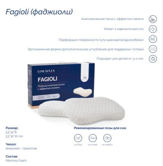 Анатомическая подушка Lineflex коллекции Biomemory Характеристики: Перфорация поверхности Материал: Пена с эффектом памяти Высота: 8 см Размер: 32*53 см Упаковка: Коробка* Подушка Fagioli сочетает в себе эргономичную форму и премиальную пену с эффектом памяти. Точечно, без ответного давления, подстраиваются под голову и шею спящего, даря максимальное расслабление. Инновационная экстра мягкая рецептура Memory foam Эргономичная форма (дополнительное углубление для поддержки головы) Нежный съемный дышащий чехол Гипоаллергенный наполнитель Упаковка в стильную коробку Онлайн заказ, доставка по всей России, стоимость доставки в цену товара не входит.