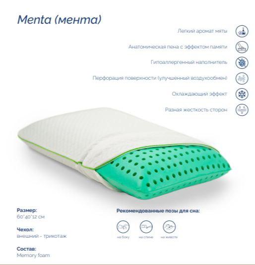 Цветная анатомическая подушка с тонким природным ароматом мяты. Характеристики: Форма: Классическая Легкий аромат Мяты Перфорация поверхности Разная жесткость сторон Материал: Пена с эффектом памяти Высота: 12 см Размер: 40*60 см Упаковка: Коробка* Цветная анатомическая подушка с тонким природным ароматом мяты. • Дышащий и гипоаллергенный наполнитель Memory foam • Два варианта жесткости за счет разной перфорации сторон • Высокая плотность пены, восстановление формы за 3-5 секунд. Устойчива к деформациям • Привычная классическая форма и размер • Нежный съемный дышащий чехол • Упаковка в стильный короб Онлайн заказ, доставка по всей России, стоимость доставки в цену товара не входит.