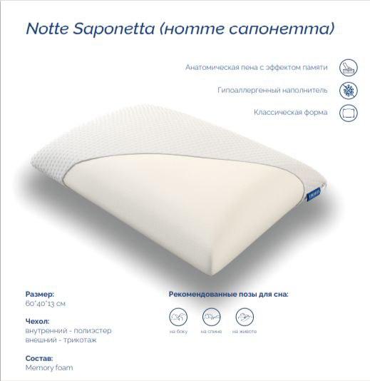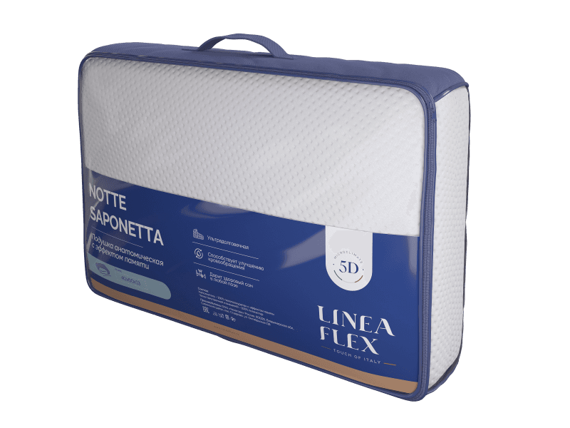 Анатомическая подушка Lineflex коллекции Biomemory Характеристики: Форма: Классическая Материал: Пена с эффектом памяти Высота: 13 см Размер: 40*60 см Упаковка: Сумка Notte Saponetta – анатомическая подушка с эффектом памяти. Классическая форма, подходит для сна в любой позе. Современный эластичный пенополиуретан с эффектом памяти в основе подушки, точечно, без сопротивления, подстраивается под голову и шею спящего, даря максимальное расслабление. Предотвращает появление морщин и способствует уменьшению отечности. Отлично вентилируется за счёт пористой структуры, обеспечивая комфортный и здоровый сон. Подушка представлена в мягкой, белоснежной наволочке на молнии, очень нежной и тактильно приятной на ощупь. Онлайн заказ, доставка по всей России, стоимость доставки в цену товара не входит.